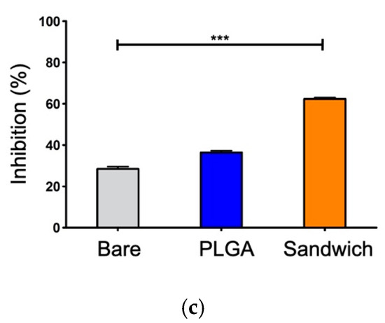 The linear regression retrieved from a gradient GA content test defined a standard reference of GA released weight and concentration (Figure 7a). The sandwich coating film triggered GA weight release at 1, 2, 3, and 6 h, with a reduced speed after three hours (Figure 7b). The free radical scavenging analysis showed that the bare, PLGA, and sandwich coatings could eliminate oxidant stress with antioxidant capacities of approximately 28%, 36%, and 63%, respectively. These data verified that the GA released from the sandwich coating film promoted scavenging of free radicals and protected the vascular tissue due to its significant anti-oxidative ability, suggesting that the sandwich coating is a promising material for vascular stents (Figure 7c).