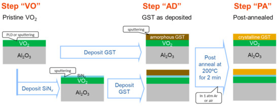 Bilayered films consisting of VO2 and amorphous GST layers were prepared on sapphire substrates of either R-plane (1−102) or C-plane (0001). Figure 1 schematically shows the sample preparation processes. In order to realize the amorphous phase, the GST layer should be deposited after VO2, since the growth of crystalline VO2 films requires a temperature higher than the crystallization temperature of GST (161 °C) [41].