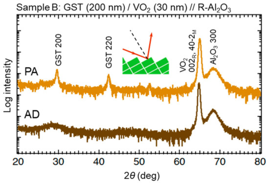 The GST film was deposited by a rf magnetron sputtering method in an argon (Ar) atmosphere of 0.5 Pa with an output power of 100 W. Intentional substrate heating was not carried out. We prepared two types of samples with and without a SiNx buffer layer between GST and VO2 (see Section 3.2). The SiNx layer was grown by rf-sputtering a Si3N4 target with a power of 200 W under 0.5 Pa of Ar. Crystallization of the GST layer was achieved by postannealing the sample at 200 °C (with a heating speed of 20 °C min−1) for 2 min in Ar atmosphere or in air. In what follows, the step with the pristine VO2 layer before GST deposition is referred to as “VO”, the step with the as-deposited GST layer on VO2 as “AD”, and the step after the postannealing of the bilayered sample as “PA”. Figure 2 shows the X-ray diffraction (XRD) profiles of a GST/VO2 bilayered sample in steps AD and PA at RT in a geometry aligned with respect to VO2 40–2M or 002R diffraction peak. The weak intensity of the Al2O3 substrate peaks is because the VO2 100M plane was slightly misoriented against the (1–102) plane of the substrate. The absence of GST peaks before annealing proved the amorphous nature of the as-deposited GST layer, while the diffraction peaks corresponding to NaCl-type GST that appeared after annealing indicated the success of the crystallization process. The cR axis is always supposed to lie in plane in VO2 films grown on C-plane Al2O3, whereas one of three geometries allows the cR axis to lie in plane on R-plane Al2O3. Table 1 shows the thickness of each layer in the four samples (A–D) reported in the present article.
