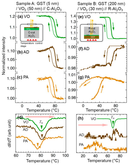 Temperature dependence of optical reflection intensity from Sample A (a–c) and Sample B (e–g) in steps VO (a,e), AD (b,f), and PA (c,g) during heating (thick lines) and cooling (thin lines) runs. The intensity is normalized at 100°C. The incident light was shone upon the film side (Sample A) or from substrate side (Sample B), as illustrated in insets of (a) and (e). (d,h) Temperature-differential profiles of reflection intensity (dI/dT) in the heating runs for Samples A and B, respectively, at the three steps. The triangle symbols indicate the peak/valley position.