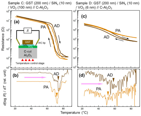 (a–d) Temperature dependence of electrical resistance (a,c) and temperature-differential profiles of the logarithm of the resistance [d(log R)/dT] in the heating runs (b,d) for Sample C (a,b) and Sample D (c,d) at AD and PA steps. Inset of (a) schematically shows the measurement configuration. The triangle symbols indicate the valley position.