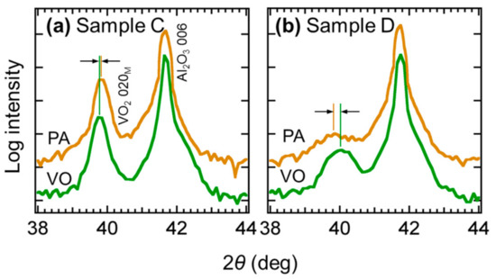 We performed a similar experiment for another sample with a thinner VO2 layer (6 nm, Sample D). The R–T curves of the sample showed a resistance change of more than one order of magnitude, suggesting the existence of a weak phase transition (Figure 4c). The fitting of the temperature differential profiles revealed Ttr of ~58 and ~52 °C in steps AD and PA, respectively, suggesting a lowering of Ttr for about 6 °C during the crystallization of GST (Figure 4d). Thinner than the VO2 layer in sample C, the VO2 layer in this sample was probably more severely affected by the stress from GST. To qualitatively observe the difference of the degree of stress, we performed XRD 2θ − ω scans of Samples C and D in steps VO and PA (Figure 5). In Sample D, a shift of the VO2 020M peak to a lower angle occurred when the ultrathin VO2 layer was capped with crystalline GST. The elongation of the out-of-plane lattice suggested the shrinkage of the in-plane lattice and cR axis, which is in agreement with our understanding. In contrast, no significant shift was observed in Sample C with a thick VO2 layer, which was consistent with the less drastic shift of its Ttr.