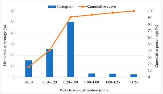 Histogram of particle size distribution and cumulative particle size distribution curve for the construction sand used in the test.