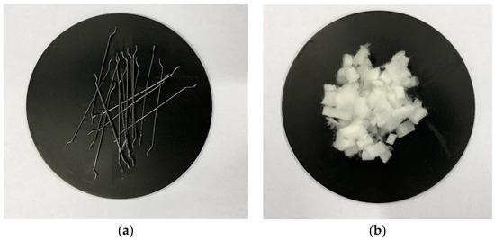 Technical sodium hydroxide in the form of flakes and an aqueous solution of sodium silicate R-145 with a module of 2.5 molar and a density of about 1.45 g/cm3 were used for the production of geopolymer masses. Tap water was used instead of distilled water. The alkaline solution was prepared by addition to the solid sodium hydroxide the aqueous sodium silicate solution and the water. The solution was mixed thoroughly and allowed to equilibrate to ambient temperature. The following materials were used to prepare the geopolymer mass: 50% fly ash, 50% fine construction sand, 1200 mL of 10 M sodium hydroxide solution together with an aqueous sodium silicate solution. Steel fibers (EKOMET, Ozorków, Poland) and melamine fibers (smartMELAMINE®, The smart polymer GmbH, Rudolstadt, Germany) were used to reinforce the composites (Figure 2).
