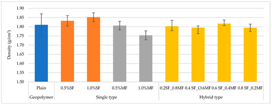 The density of geopolymer composites can vary greatly due to many factors affect it. Polymer fibers have a lower density than geopolymers, while steel fibers have a density comparable or higher. However, using fibers with a higher density than geopolymers not guarantee that the density always increases, and with polymer fibers decrease. This means that the density of the composite can be (1) increased, (2) decreased, or (3) the same as in the case of unreinforced geopolymer fibers due to entanglement processes [50].