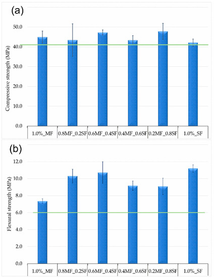 Figure 6a,b presents the results obtained from the bending and compression tests. The density of the tested composites (Figure 4) increased with the increase of the steel fibers content, reached the value of 1.85 g/cm3. The density of the composite with melamine fiber was 1.75 g/cm3. Figure 6b displays changes in flexural strength. Initially, as the amount of steel fiber increased, the bending strength also increased, achieving the best results with 0.6% by weight of melamine fiber and 0.4% of steel fiber, while further enhancement of the steel fiber content caused a decrease in bending strength.