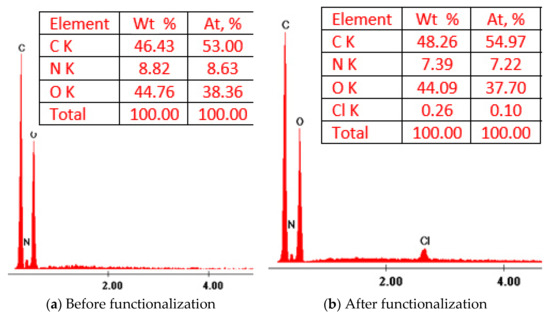 X-ray dispersion (EDX) spectra of unfunctionalized and functionalized bio material.