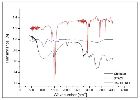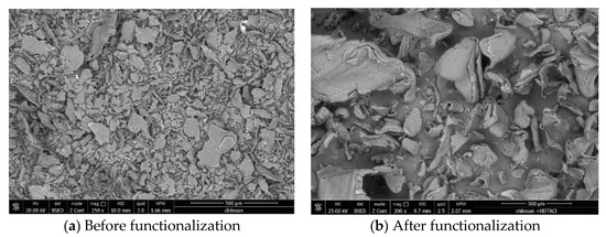 From pictures depicted in Figure 2, we can observe that the chitosan surface suffers some morphological modification after the functionalization with hexa-decyl-trimethyl-ammonium chloride. Before functionalization, chitosan has a heterogeneous morphology with dispersed particles, presenting different sizes and geometry. After functionalization with HDTACl can be observed the presence of some molecular agglomeration related with the presence of some electrostatic forces between different molecules. Additionally, we observed the same heterogeneous morphology, with different particles size and more rounded geometrical shapes.