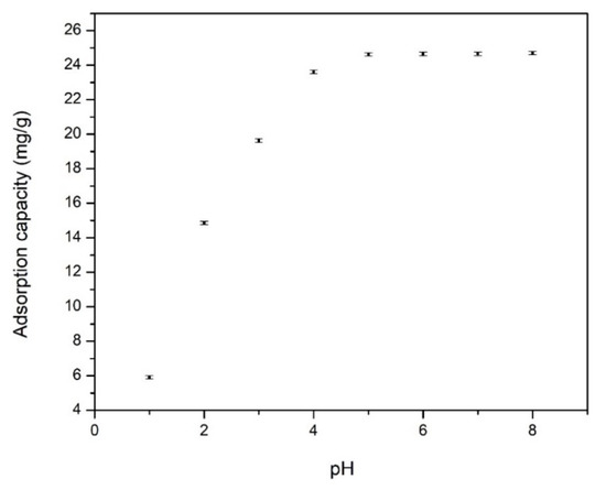 In order to evaluate how the pH is influencing the adsorption of Cd ions, all experiments were carried out with the pH interval 1 to 8. Experimental studies were not conducted at pH higher then 8 because at pH over 8, Cd(II) precipitate [10,37]. Experimental adsorption capacities obtained when was evaluated the pH influence are depicted in Figure 4.