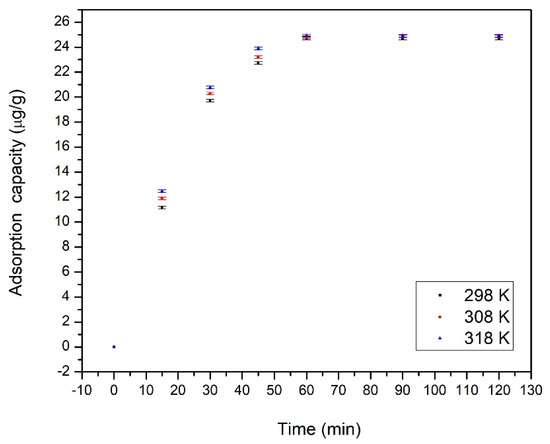 From the data presented in Figure 5, we can observe that the maximum adsorption capacity increases with the increase of contact time and with the temperature increase. Based on the obtained data, we can observe that the adsorption capacity increases for the first 60 min, after that, further increase of contact time has no significant influence over the maximum adsorption capacity. Due to that, the optimum contact time used for further experiments was set to 60 min. It can also be observed that the increase of the temperature has almost no influence on the maximum adsorption capacity, so further experiments were carried out at room temperature (298 K).