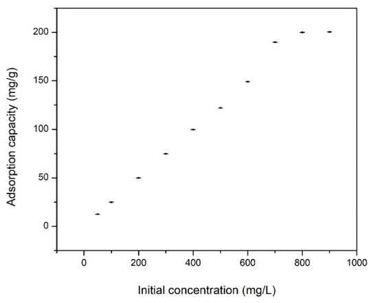 Based on data depicted in Figure 6, we can observe that the adsorption capacity increases with the increase of the Cd(II) initial concentration, until it reaches a plateau. In this moment, the adsorbent material was saturated with Cd ions, this saturation occurs when the initial concentration of Cd ions has a value of 700 mg·L−1, which corresponds to a maximum adsorption capacity of 204.3 mg·g−1.