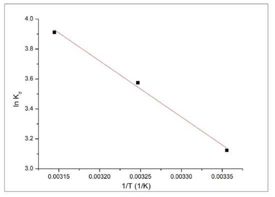 Standard enthalpy and standard entropy variations can be calculated from the linear representation of van’t Hoff equation (ln kd versus 1/T—depicted in Figure 9):