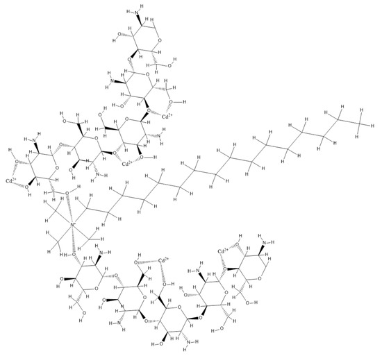 By functionalizing chitosan with HDTACl, the extractant molecule can be inserted between chitosan chains, which expose a higher number of –OH groups. Further, the Cd ions will form these groups by coordinative bonds with oxygen atoms.