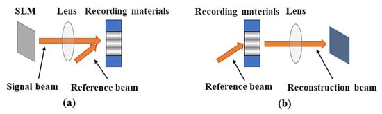 Principle of the holographic recording and reading process: (a) holographic recording process; (b) holographic reconstruction process, SLM, spatial light modulation.