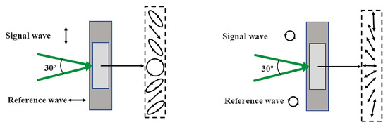The polarization properties of light and its anisotropy process in propagation increase as the degree of freedom, which can be controlled; this is called the polarization state. In 1965, Lohmann first proposed a method to record the polarization state of light with two orthogonal polarized beams [3]. In 1968, Foumey et al. described an experimental method to record and reproduce the polarization state of light, which verified Lohmann’s theory [4]. Holography that can record the polarization information of light is called polarization holography. Polarized holography is different from traditional holography, which can modulate the recording and reproduction of information using the polarization state. As presented in Figure 2, two orthogonally polarized waves interfere, forming an interference field with the periodic change of the polarization states.