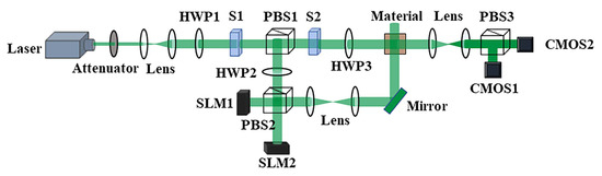 Polarization multichannel multiplexing device: S, HWP, PBS, SLM, and COMS are the shutter, half-wave plate, polarization beam splitter, spatial light modulation, and complementary metal oxide semiconductor sensor, respectively.