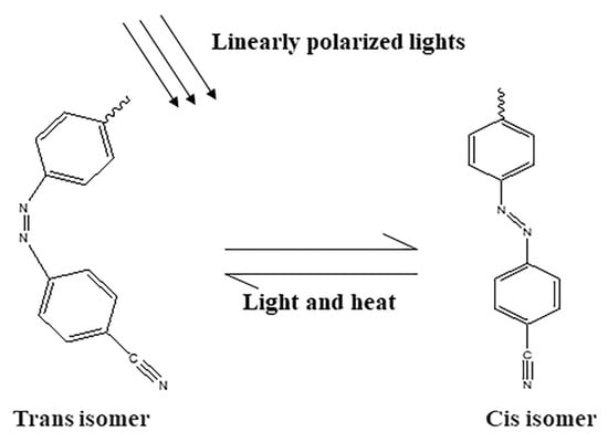 Azo materials are a class of materials with a molecular structure of , which has two isomer structures of cis and trans, as shown in Figure 4; their photochromism is caused by the cis-trans isomerization of molecules under the action of light. The rearrangement of the molecules makes the material anisotropic, and the ordered and disordered arrangement of molecules forms a grating. When different polarized states of light are applied to the material, the molecules will reorient to realize the writing and erasing of information. The number of cis and trans isomers can be controlled by irradiating different wavelengths of light because the cis and trans isomers of azo materials have different absorption spectra. Because of the photothermal instability of material molecules, the recording performance of azo materials is easily restricted and affected by the environment.