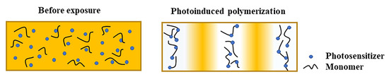 A typical photopolymer system generally includes the photosensitizer, monomer, and initiator. The photosensitizer and initiator can form a photosensitive initiation system because both can promote the polymerization of monomers during the photopolymerization process [35]. Photosensitive initiation systems are the dominant component of the initial process of the photochemical reaction. After photopolymerization, monomers polymerize to form a polymer substrate, and the monomers react with photosensitizers to form photoproducts. Different photosensitive initiation systems can be selected to obtain different sensitivity wavelengths and photoinitiation sensitivity, which also determines the polarization sensitivity of the material. The basic process of photopolymerization for the formation of holographic recording grating is shown in Figure 5. The monomer and photosensitizer are uniformly distributed in the material system before exposure. When light shines on the sample, the photosensitizer absorbs photons and is excited and then reacts with the monomer to generate light products. Under exposure, the monomers are consumed the fastest in the polymerization interference areas. The increasing consumption of monomers in the bright regions forms a concentration gradient that leads to the diffusion of monomers from the dark areas to the light ones. This ends when most of the monomers consumed in the material have been polymerized into chains. The material-dependent refractive indexes are different from each other, and a phase grating can be implemented to record optical information.