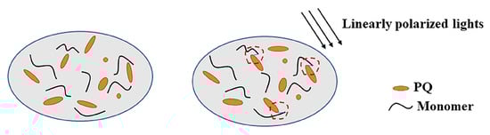 The molecular structure of phenanthrenequinone has carbon-oxygen double bonds and carbon-carbon double bonds, which are highly conjugated two-dimensional planar structures. PQ molecules in different directions are randomly distributed in the material without illumination, and the material is isotropic, as presented in Figure 6. The orientation of the PQ molecules parallel to the light polarization state is more likely to react with the monomer in a specific area when irradiated with linearly polarized light. PQ absorbs photons and is excited to form a singlet excited state under illumination. The singlet excited state changes to a triplet excited state , and hydrogen donors represented by the macromolecules RHare removed to generate active free radicals . Among them, R represents the preformed PMMA polymer chain in the matrix of the layer. The free radical initiates the photo-linking reaction, which produces the photoproduct by a one-to-one linking reaction with the unsaturated vinyl on the MMAmolecule [36,37]. This light reaction will cause polarization distribution, make the material anisotropic, and form a polarization grating to realize polarization holographic recording.