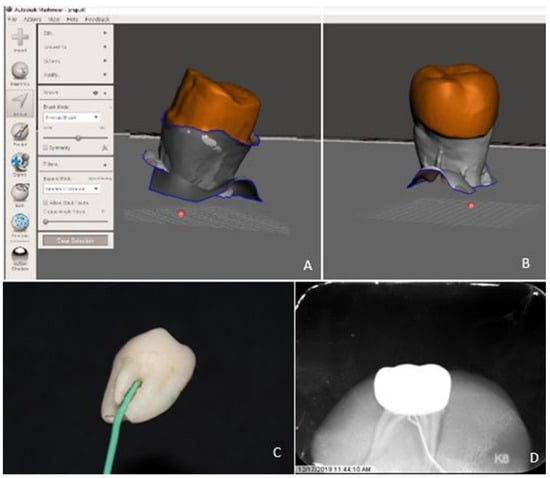 Prepared surfaces of teeth (A) and cameo surfaces of the crowns (B) were scanned to calculate tooth surface area and the tooth volume. To measure pulpal temperature changes, a 3 mm diameter hole was drilled through the furcation (C) to enable insertion of a temperature probe into the pulpal chamber (D).