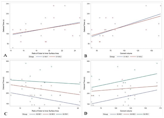 Correlations of debond time with ratio of outer to inner surface area (A,C) and cement volume (B,D) for primary (A,B) and permanent (C,D) teeth.