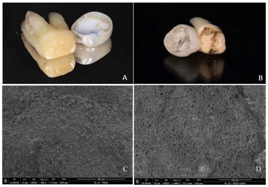 Clinical view of the tooth and crown following laser-debonding from primary (A) and permanent (B) tooth. Tooth surface (C) and intaglio surface of the crown (D) appeared to be undamaged and covered by the residual cement on the SEM analysis.