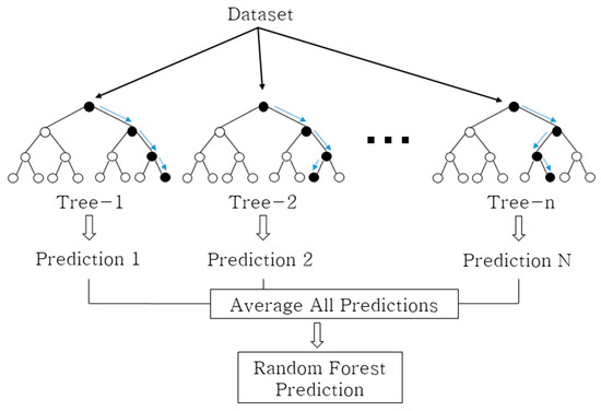 The random forest developed by Breiman [44] takes into account the large variance of decision trees and is a model that uses an ensemble-learning method to learn multiple decision trees randomly. An ensemble is a method that improves prediction accuracy levels by learning multiple models from given data and then synthesizing the prediction results of multiple models.