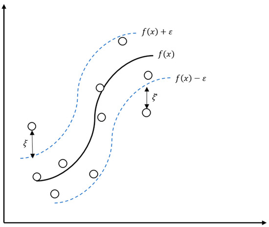 SVR described above is a linear prediction technique. In order to find a non-linear function as shown in Figure 3, it is necessary to map the given data into a high-dimensional feature space, called kernel space. Several kernel functions are available [45], but the radial basis function (RBF) kernel function is used in this study (Equation (15)):