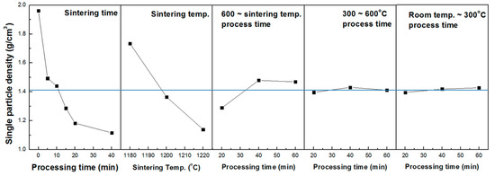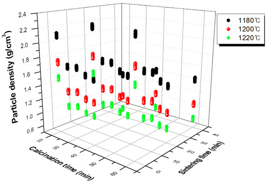 Table 2 shows the orthogonal array experiment design table and single particle density measurement results. The experiment was designed and tested with an orthogonal array table L18(3661). The three important variables in the experiment were sintering temperature, sintering time, and calcination time. Drying conditions did not significantly affect the properties of the final aggregates. Figure 4 shows the effect of each variable. It can be seen that the higher the sintering temperature, the lower the density of the aggregate. Moreover, the longer the holding time, the lower the density gradually, but after 20 min, the density no longer decreased. In addition, when the calcination time was 20 min, a lower density level could be obtained.