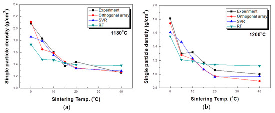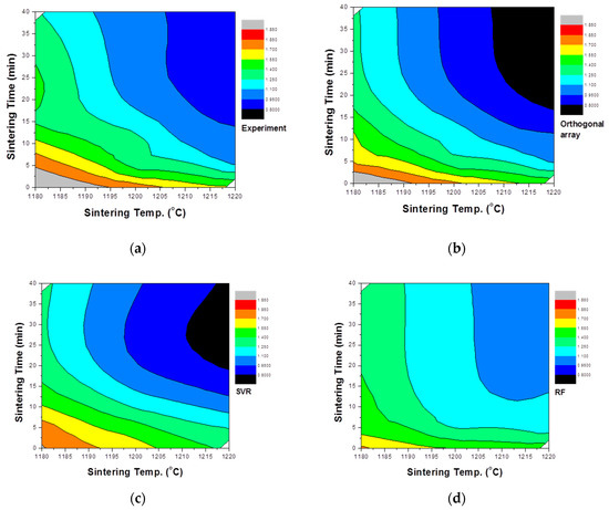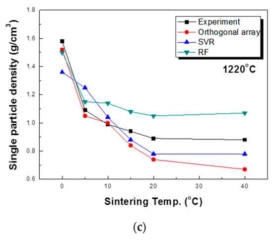 Additional experiments were conducted to compare the actual experimental results and modeling results. This is shown in Table 4. The main parameters, sintering temperature and sintering time, were considered, and calcination time and drying time were fixed. In order to compare the actual experimental results with the predicted trends for each model, contour lines were based on the measured density values with the sintering temperature and time used as variables (Figure 6). As a result of this analysis, the tendency for the density to decrease as the sintering temperature increases and with longer sintering times is clearly visible. The predicted value of the single particle density differed according to the modeling method. For the value predicted through the orthogonal array experiment design, the maximum value tended to be rather large and the minimum value rather small. This likely occurs because not all interactions are reflected when predicting values using the orthogonal array experiment design. For this reason, while orthogonal array experimental design techniques are used in many fields [50,51,52], their experimental predictions are not well utilized. In a study by Chen [53], an optimal process was designed using an orthogonal array table, but a loss function value was used instead of an experimental value. In this prediction result, as described above, the result was somewhat overestimated in terms of the maximum and minimum values. The results predicted by the random forest method were suitably reflected in the trends of the sintering temperature and time but were predicted to be more biased toward the average than the actual values. On the other hand, the result predicted by SVR was somewhat inaccurate in terms of the maximum value part compared to the actual experiment, but the properties were predicted to be closest to the most commonly measured result among the three models. For a better comparison of the actual experiments with the prediction results, the results of measuring the particle density of aggregates sintered at temperatures of 1180, 1200, and 1220 °C are compared with the predicted values of each model, as shown in Figure 7. The results predicted by the orthogonal array experiment design are in good agreement with the actual measurement results. However, the single particle density was predicted to be much lower than the measured values at 20 min and 40 min at a temperature of 1220 °C. For the random forest method, the coincidence of the trend was confirmed, but the single particle density was predicted to be relatively high at 20 and 40 min, representing the time points at which the single particle density change is nearly saturated. In the SVR case, the single particle density value at 0 min was predicted to be lower, but it was confirmed that the remainder was predicted to be closer to the actual experimental value. In particular, under the conditions of 20 min and 40 min at 1220 °C, the closest accurate predicted value was obtained. In general, in statistics, various methods are tried and verified when analyzing data because it is impossible to know which method is better before analysis. In this study, SVR appeared as the most suitable modeling method, and the reason is thought to be due to the characteristics of individual methods. Linear regression requires strong assumptions: linear relationship between dependent variables and the target variable, normally distributed errors, homoscedasticity of errors and independence of the points. In general, it is very hard to satisfy the above assumptions in real world data. Decision tree ensembles including random forest tend to be overly complicated in the process of learning non-linear relationships with a small number of points. As a result, it is likely to be unstable in the phase of prediction of new data. In this study, we use the kernel SVR with a radial basis function. Unlike the above two models, it is known that the kernel SVR is good at learning complex and non-linear relationships between variables [54].