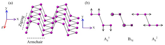 (a) Crystalline structure of black phosphorus, (b) atomic displacements of the Raman-active modes in black phosphorus.