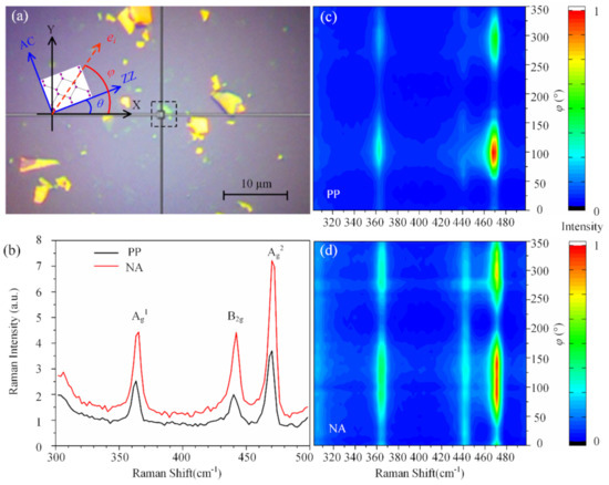 Figure 3a is an optical image of a phosphorene sample. The cross point in the dashed box is the position of the phosphorene measured by micro-Raman spectroscopy. AC and ZZ represent the crystalline orientation of the phosphorene, φ is the polarization angle of the incident laser relative to the horizontal X-axis, and θ is the angle of the ZZ direction (z-axis in Figure 2a) with respect to the X-axis. Figure 3b is a Raman spectrum of the phosphorene in the PP and NA configurations, respectively, when φ = 0°. The peak positions of Ag1, B2g and Ag2 modes correspond to about 364 cm−1, 442 cm−1 and 471 cm−1, respectively [36].