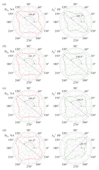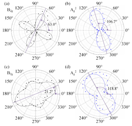 The experimental data of the B2g mode under the PP and NA configurations were fitted by using Equations (8) and (10), and the fitting results are given as the IB-PP and IB-NA curves in Figure 4a,c, respectively. Similarly, the experimental data of the Ag2 mode under the PP and NA configurations were fitted by the models given in published papers [47], and the results are given as the IA2-PP and IA2-NA curves in Figure 4b,d, respectively.