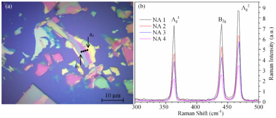 Figure 5a shows an optical image of the multi-layer sample used in this work. The Raman data were detected from four sampling spots on this sample, denoted as a1 to a4. From the image, the colors of the sample at different sampling spots are quite dissimilar, which means that the sampling spots had different thicknesses or layer numbers when they were detected by micro-Raman spectroscopy. At each sampling spot, the Raman spectra were recorded in different polarization directions, denoted as φ, of the incident laser arriving at the sample under the NA configuration. Figure 5b gives the Raman spectra detected from a1 to a4 under the NA when φ = 0°.