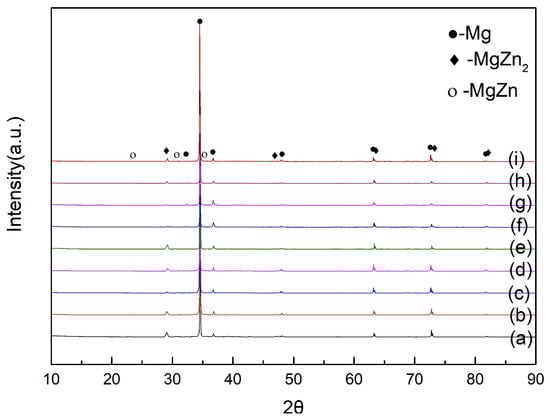 XRD diagram for different heat treatment conditions. (a) Hot rolled state; (b) at 170 °C for 4 h; (c) at 170 °C for 12 h; (d) at 170 °C for 28 h; (e) at 400 °C for 3 h; (f) at 400 °C for 3 h and 170 °C for 12 h; (g) at 400 °C for 3 h and 170 °C for 24 h; (h) at 400 °C for 3 h and 170 °C for 28 h; (i) at 190 °C for 12 h.