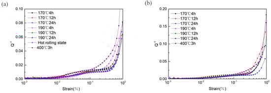 The damping mechanism of magnesium and magnesium alloys is dislocation damping. According to the Granato-Lücke (G-L) model [,], the dislocation damping of magnesium alloys mainly consists of two types, strain-independent damping, Q0−1, and strain-dependent damping, Qh−1, so