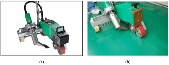 Automatic hot air welder and welding status: (a) automatic hot air welder; and (b) hot air welding status.