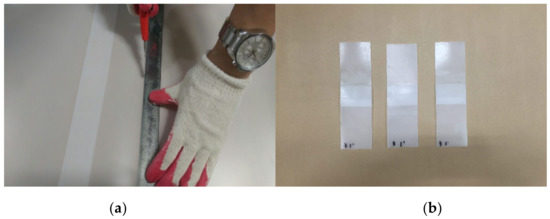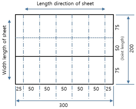 The joint tensile performance test specimens were produced from EVA sheets with joints formed under specific temperatures (−10, −5, 0, 20, 25, 30, and 35 °C) and specific hot air welding speeds (3, 4, 5, 6, 7, 8, 9 m/min). Figure 3 shows a 200 × 50 mm2 specimen with a joint length of 50 mm and Figure 4 illustrated the cutting specimen preparation process. The seasonal temperature conditions was set in accordance to the Korean statistics [31], as the experimental parameters were set in accordance to the environmental conditions specific to Korea.