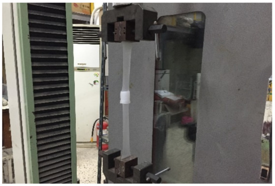The tensile performance test was conducted by stretching both ends of the specimen at a speed of 100 mm/min at room temperature (20 ± 2 °C, 65 ± 20%) until the specimen underwent rupture (process is illustrated in Figure 5 below), and it was represented as the average value of three specimens and calculated using Equation (1), as follows.