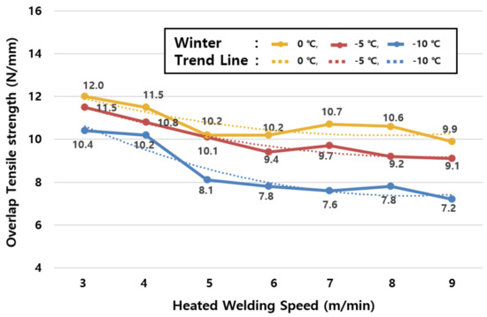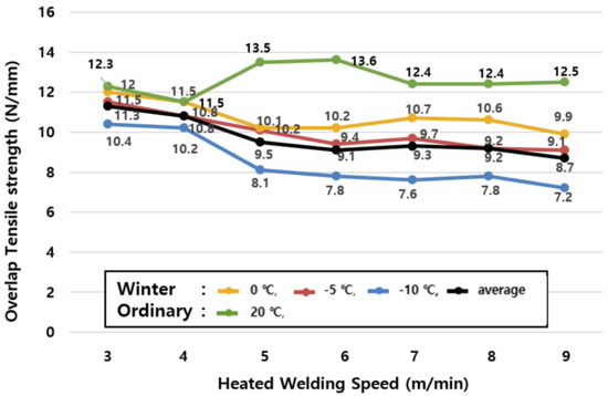 The average value of tensile strengths by season in Table 6 and the change of tensile strengths in winter (−10, −5, and 0 °C) shown in Figure 6 reveal that the tensile performance tends to decrease even further as the ambient temperature decreases, but the welding speed increases.
