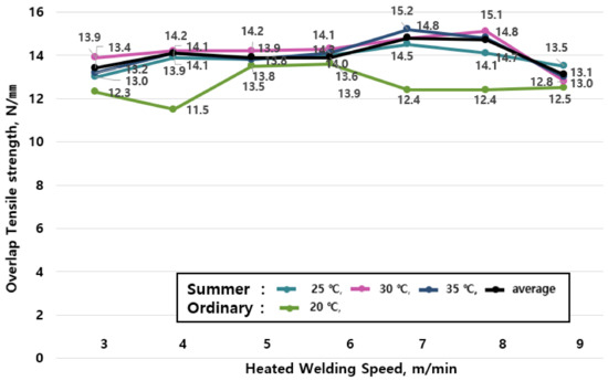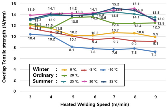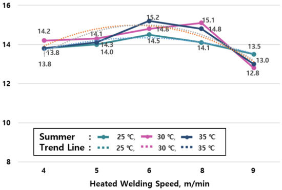The average value of tensile strengths by season are shown in Table 6 and the change of tensile strengths in summer (25, 30, and 35 °C) shown in Figure 7 reveal that the tensile performance increases as the ambient temperature rises, and the welding speed increases.