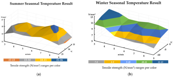 The above results are also expressed in a 3D graph that shows a comprehensive correlation between the EVA sheet joint overlap tensile strength changes to temperature condition and welding speed. As can be seen in Figure 11a, there is a general consistency of tensile strength throughout the welding speed and temperature conditions (with occasional peaks and increases of up to 22~23% in tensile strength). This is indicative of the factor that when EVA sheets are installed in temperate regions similar to Korea, construction during the summer should ensure high strength of EVA sheet roofing. However, the results clearly indicate that installation during winter is not recommended in lower temperature conditions. If in case winter installation cannot be avoided, Figure 11b shows that a low welding speed is recommended, as the tensile strength is similar to the ranges found during normal temperature conditions. Refer to Figure 11 below for details.