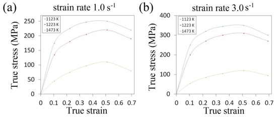 The relationships between true stress and true strain for X32CrMoV12-28: (a) strain rate 1.0 s−1; (b) strain rate 3.0 s−1.