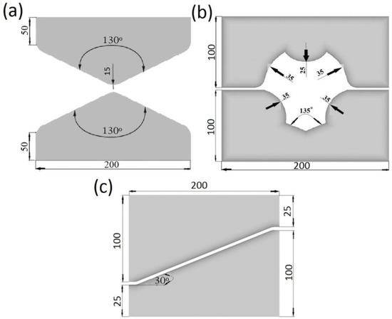 In numerical calculations, the charge ø80 mm × 200 mm was adopted; the calculations were conducted for X32CrMoV12-28 die steel, which had the following chemical composition: C—0.35%, Mn—0.45%, Cr—3.50%, Si—0.40%, V—0.50% and Mo—2.50. Forging was conducted in several consecutive technological passes with rotating by an angle of 90°, with maintaining the constant true reduction ratio εh= 0.35 and the constant feed rate amounting to lw = 0.75 in every pass. Forging was conducted in two anvils for preparing—one convex, which had the impression angle of 130° (Figure 2a), and one in a three-radial assembly (Figure 2b)—and also in an anvil with a skew working surface (Figure 2c) for conducting a complete technological process.