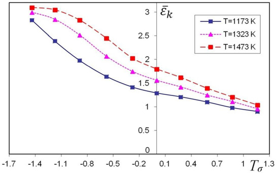 For the X32CrMoV12-28 die steel, experimental model sample upsetting was conducted in order to determine the relationships between the threshold strain and the stress triaxiality and temperature. The calculations were made for samples with heigh/-diameter ratio H/D = 0.40–1.50 for different values of the friction factor, 0.05–0.70, and for three temperatures, 1173, 1323 and 1473 K, by the finite element method. The initial diameter was ø30.0 mm and the initial height of the sample was determined from the adopted height/diameter ratio value (0.40, 0.50, 0.75, 1.0, 1.25 and 1.50). The samples were deformed to a final height at which cracks were observed on the free surface. The values of the friction factor used in the calculations were also determined on the basic of additional ring compression tests. The determined component of the stress tensor σz on the free surface, in the middle of the sample height, assumed negative values in all cases (compressive stress). Tensile stress σΘ acted in the circumferential direction; hence, the calculated mean stresses on the free surface, in the middle of the upset samples, assumed variable values from tensile to compression. The conducted research allowed to establish the relationships between the threshold effective strain and stress triaxiality and temperature for the X32CrMoV12-28 die steel, which are presented in Figure 3.