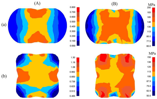 Distribution of effective strain (A) and effective stress (B) after the cogging process in convex anvils with an angle of 130°: (a) after first pass; (b) after the second pass (reduction ratio 0.70).