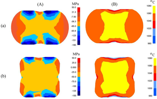 Distribution of mean stresses (A) and temperature (B) after the cogging process in convex anvils with an angle of 130°: (a) after first pass; (b) after the second pass (reduction ratio 0.70).