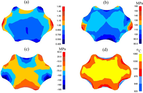 Distribution of the effective strain (a), effective stress (b), mean stresses (c) and temperature (d) after the cogging process in the assembly of three-radial anvils after the second pass (reduction ratio 0.70).