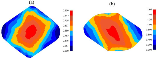 Distribution of effective strain after the cogging process in anvils with skew working surfaces after the second pass (reduction ratio 0.70): (a) feed rate of 0.75; (b) feed rate of 1.20.