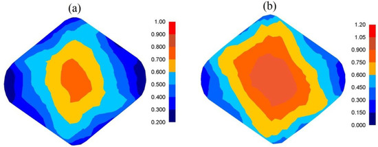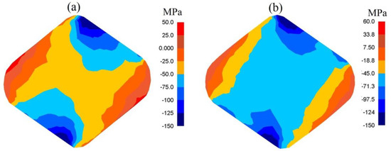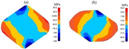 Distribution of mean stresses after the cogging process in anvils with skew working surfaces after the second pass (reduction ratio 0.70): (a) feed rate of 0.75; (b) feed rate of 1.20.